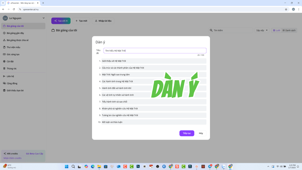 Sau khi nhấn tiếp tục, công cụ sẽ đưa ra cho bạn 1 gợi ý về dàn ý chi tiết của bài giảng. Bạn có thể chỉnh sửa chi tiết, thứ tự giàn ý và sau đó bấm tiếp tục để đi đến bước chọn mẫu bài giảng.