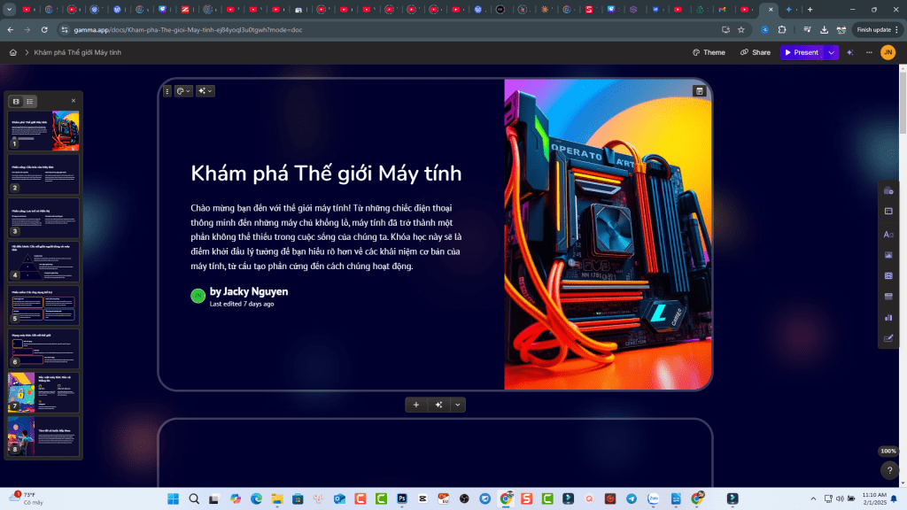 Trong kỷ nguyên số hóa, việc tạo một bài thuyết trình ấn tượng không còn là thách thức khi công nghệ AI đã mang đến cuộc cách mạng trong thiết kế slide. Từ việc tự động tạo nội dung, đề xuất bố cục cho đến tối ưu hóa hình ảnh, AI đã trở thành người trợ lý đắc lực giúp người dùng tiết kiệm thời gian và công sức, đồng thời nâng cao chất lượng thuyết trình.