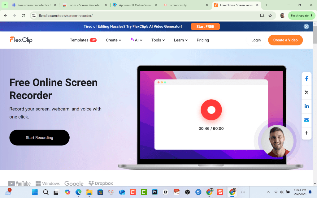 FlexClip là một nền tảng chỉnh sửa video dựa trên web bao gồm trình ghi màn hình. Nó cho phép bạn ghi lại màn hình, webcam hoặc cả hai, sau đó ngay lập tức chuyển sang trình chỉnh sửa để tinh chỉnh bản ghi của bạn. Nền tảng này được thiết kế để thân thiện với người dùng, ngay cả đối với những người không có kinh nghiệm chỉnh sửa video trước đó.