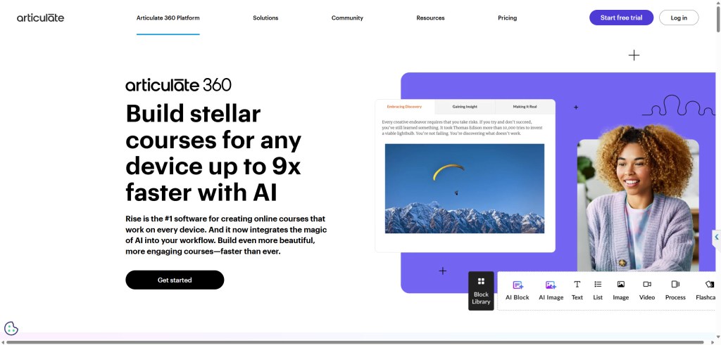 - Tốc độ và sự đơn giản vượt trội: Đây là ưu điểm lớn nhất của Rise 360. Thay vì phải thiết kế từng slide, bạn chỉ cần chọn các “khối” (blocks) nội dung được thiết kế sẵn như văn bản, hình ảnh, video, câu đố tương tác, timeline… và điền thông tin. Việc này giúp rút ngắn thời gian phát triển khóa học từ vài ngày xuống còn vài giờ.